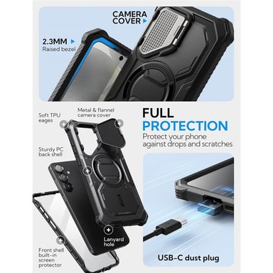 Suojakuoren reunat on nostettu 1,8 mm näytön yläpuolelle, ja kamera on varustettu linssisuojalla paremman suojan takaamiseksi. Kohotetut reunat tarjoavat erinomaisen suojan, kun puhelin asetetaan näyttö alaspäin tasaiselle pinnalle.