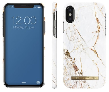 iDeal fashion suojakuori suojaa iPhone X/Xs -puhelintasi kolhuilta ja naarmuilta. Upeat kultaiset yksityiskohdat ja marmorikuvio tuovat tyyliä ja ripauksen luksusta arkeen. Kestävästä muovista valmistettu kuori ja mokkanahalla reunustettu sisus tarjoavat puhelimellesi hyvän suojan.