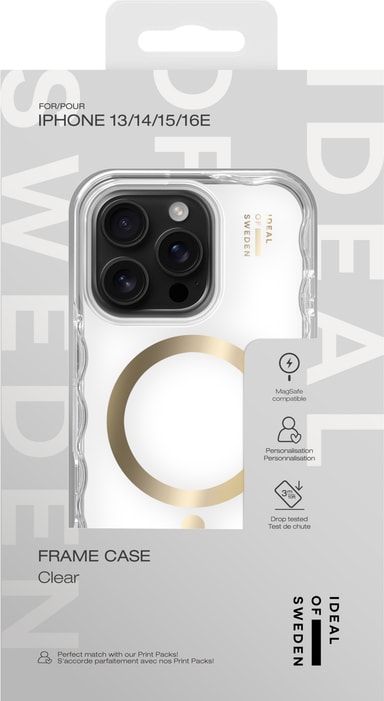Korosta puhelimesi ulkonäköä MagSafe-yhteensopivalla Ideal of Sweden iPhone 13/14/15/16E/17E Frame -suojakuorella. Siinä on läpinäkyvä takaosa, tyylikäs kehys ja 3 metrin pudotussuoja, ja se toimii Print-inserttien ja langattomien latureiden kanssa.