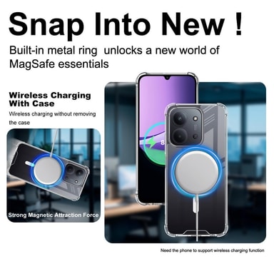 Tämä puhelinkotelo on valmistettu TPU- ja PC-materiaalien yhdistelmästä, joka tarjoaa tasapainon joustavuuden, kestävyyden ja suojan välillä. Korkea läpinäkyvyys mahdollistaa puhelimen alkuperäisen muotoilun ja värin näkymisen selkeästi. Ilmatyynyillä varustetut kulmat suojaavat tehokkaasti iskuilta ja pudotuksilta. Korotettu reuna kameran ympärillä suojaa linssiä naarmuilta ja vaurioilta. Kotelo on täysin yhteensopiva MagSafe-latauksen ja lisävarusteiden kanssa.