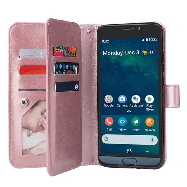Lompakkokotelo Tupla-kääntö 9 korttia, täydellinen niille, joilla on paljon kortteja.  - Kestävä silikonirunko (flexi) pitää puhelimen paikoillaan.  - Piilotettu magneettinen lukitus pitää liikkuvan lompakon kiinni.  - Aikat suljetaan napilla.  Tekniset tiedot  Väri: musta, ruskea, punainen, vaaleanpunainen, kulta, vaaleansininen, minttu  Korttipaikkojen lukumäärä: 9 (joista 1 valokuvatasku)  Setelien lukumäärä: 2 kpl  Valokuva taskut: 1.  Muu: Rannehihnaan  Kanssa: Doro 8050 Mallinumero: 8050 (5.7"") Materiaali: PU-nahka