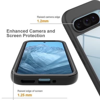 Suojaa puhelimesi vahingossa tapahtuvilta putoamisilta. Kestävä, läpinäkyvä PC-kuori ja iskuja vaimentava TPU-puskuri takaavat pitkäkestoisen suojan. Sisäänrakennettu PET-näytönsuoja suojaa näyttöä naarmuilta heikentämättä kosketusherkkyyttä. Kohonneet reunat (1,2 mm kameran kohdalla ja 1,25 mm näytön kohdalla) tarjoavat lisäsuojaa. Tiivis, kaksikerroksinen muotoilu näytönsuojalla sopii täydellisesti puhelimeesi. Vahvistettu kehys tarjoaa hyvän iskunvaimennuksen.