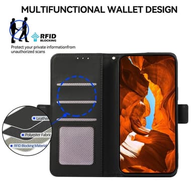 Tämä tyylikäs PU-nahasta ja TPU-materiaalista valmistettu kotelo tarjoaa kestävän suojan laitteellesi. Sisäänrakennettu RFID-suojaustekniikka estää luvattoman skannauksen ja pitää tietosi turvassa.Tutustu ominaisuuksiin