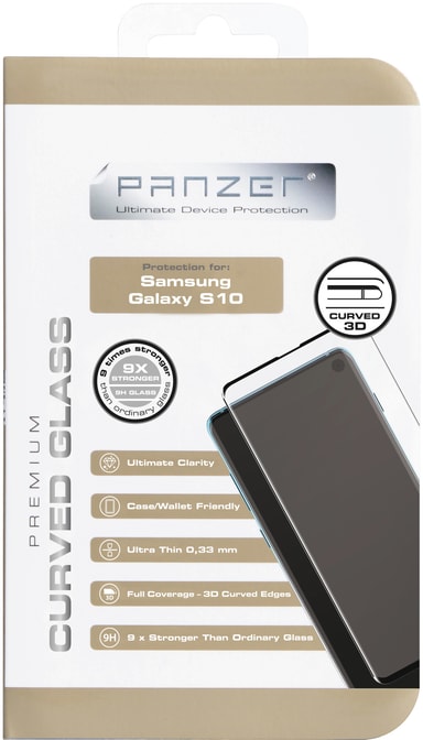 Suojaa Samsung Galaxy S10 -älypuhelintasi kaarevalla Panzer -näytönsuojalla, joka on helppo kiinnittää paikoilleen niin, ettei suojan ja näytön väliin jää ilmakuplia. Suoja on valmistettu erittäin kovista materiaaleista ja 0,33 mm paksuuden ansiosta se on lähes huomaamaton. Särkymätön rakenne takaa sen, että mikäli lasi rikkoutuu, sirpaleet eivät ole teräviä.