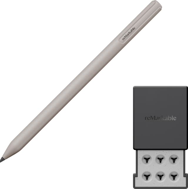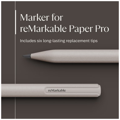 Täysin uusi Marker on suunniteltu pitkäikäiseksi, ja siinä on kuusi varakärkeä, jotka on sijoitettu kätevään Marker-kärkikoteloon, jotta niiden vaihtaminen on vaivatonta. Hiilitäytteiset kärjet on suunniteltu kestämään kaksi kertaa kauemmin kuin reMarkable 2 -kynässä käytetyt kärjet, mikä takaa, että kirjoituksesi pysyy terävänä ja tasaisena pitkään.