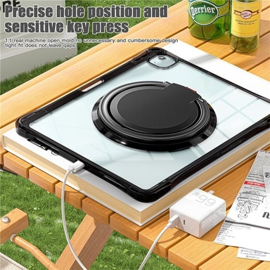 Tämä kestävä suojakuori yhdistää toiminnallisuuden ja suojan 360° pyörivällä ja 180° taittuvalla kahvalla, jonka avulla voit kantaa, ripustaa tai käyttää tablettia eri asennoissa. Valmistettu PC-, TPU- ja akryylimateriaaleista, se tarjoaa kattavan suojan pudotuksia, iskuja ja päivittäistä kulumista vastaan. Vahvistetut kulmat vaimentavat tehokkaasti iskuja. Säädettävä jalusta mahdollistaa vakaan ja kädet vapauttavan käytön eri kulmista. Läpinäkyvä akryylitausta esittelee tabletin muotoilun ja suojaa samalla tehokkaasti.