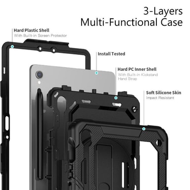 Tämä tablettikotelo koostuu useista suojaavista kerroksista sekä TPU:ta että PC:tä, jotka suojaavat koko tablettia. Käytännöllinen integroitu teline ja kahva. Irrotettava olkahihna, jotta tablettia on helppo kantaa mukanasi töissä, koulussa tai vapaa-ajalla. Integroitu näytönsuoja pitää tabletin näytön suojattuna lialta ja naarmuilta.