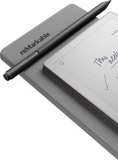 reMarkable Paper Pro Move Polymer Weave Book Folio (harmaa) pitää paperitablettisi turvassa ja tyylikkäänä. Polymeerikudoskuori kiinnittyy laitteeseesi magneettisesti ja tarjoaa herätys-/lepotoiminnon sekä merkintöjen säilytystilan.Tutustu ominaisuuksiin