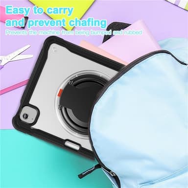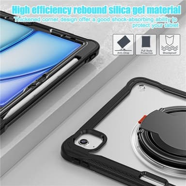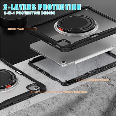 Tämä kestävä suojakuori tarjoaa erinomaisen suojan tabletille päivittäisessä käytössä. 360 astetta pyörivä kahva mahdollistaa laitteen ripustamisen mihin tahansa ja tarjoaa monipuoliset kantovaihtoehdot. Paksunnetut silikonikulmat vaimentavat iskuja tehokkaasti ja suojaavat pudotuksilta. Kaksikerroksinen rakenne yhdistää kestävän TPU-ulkopinnan ja kovan PC-sisäkuoren täydelliseen suojaan. Sisäänrakennettu jalusta tukee sekä vaaka- että pystyasentoa, mahdollistaen mukavan katselukulman. Sivussa oleva kynäpaikka pitää styluksen kätevästi saatavilla (stylus ei sisälly).