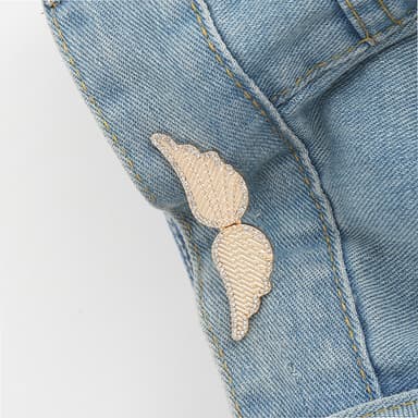 Häikäisevä strassisiiven muotoilu: Näissä farkkunappineuloissa on kaunis strassilla koristeltu siipimalli, joka lisää asuihisi ripauksen glamouria ja kimallusta. Kullanvärinen viimeistely täydentää strasseja luoden elegantin ja katseenvangitsevan asusteen.