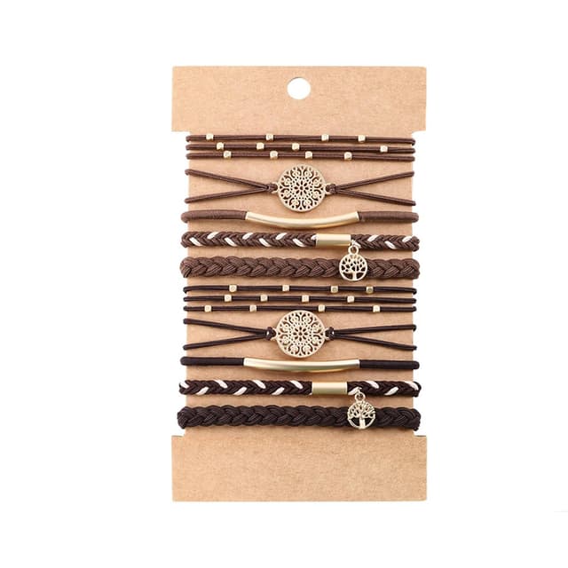 Tyylikäs hiuslisäke: Korosta jokapäiväistä tyyliäsi tällä kahvin ja tumman kahvin hiuslenkkirannekorujen setillä. Nämä monipuoliset asusteet toimivat sekä tyylikkäänä rannekoruna että luotettavana hiuslenkkinä, varmistaen, että olet aina valmis hallitsemaan hiuksiasi samalla kun lisäät ripaus eleganssia ranteeseesi. Neutraalit sävyt täydentävät monenlaisia asuja, mikä tekee niistä täydelliset kaikkiin tilaisuuksiin, arkisista retkistä muodollisempiin tapahtumiin. Nauti näiden välttämättömien asusteiden mukavuudesta ja muodikkaasta muotoilusta.