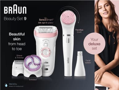 Braun Silk-épil 9 SensoSmart -kauneuspakkaus sisältää kaiken tarvittavan ihokarvojen poistoon. Se sisältää 6 lisäosaa kasvoille ja vartalolle sekä ihon kuorintaan ja puhdistukseen. Se toimii langattomasti myös suihkussa.Tutustu ominaisuuksiin