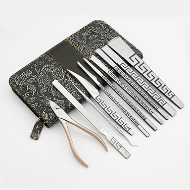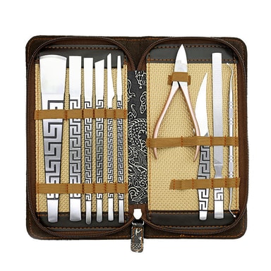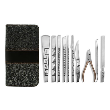 Lohkoveitsi, adze, lansetti, vartaat, hammaskaavin, litteä kynsileikkuri, kulmakynsileikkuri, kynsileikkuri, kynsiviila ja kotkapihti sisältyvät tähän ammattipakkaukseen. Se on korkeaksi taottu mangaaniteräs pedikyyrisetti.