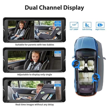 6,8 tuuman auton vauvanvalvonta, 360 asteen kierto, kaksoiskamera, 8 LEDiä, Full Color HD, infrapunayönäkökamera【Parannettu turvallisuus】 6,8 tuuman auton vauvanvalvonta kaksoiskameroilla vähentää vanhempien pään kääntämisen tarvetta ajon aikana ja vTutustu ominaisuuksiin
