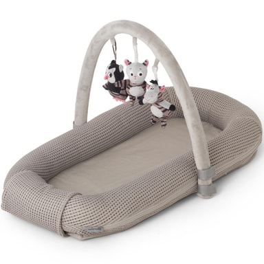 Irrotettava samettinen leikkikehys, jossa 3 lelua: Pöllö, kissa ja virtahepo.