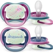 Pimeässä hohtavassa Philips Avent Ultra Air Nighttime -tutissa on huomioitu vauvan herkän ihon hyvinvointi. Tutissa on neljä suurta ilma-aukkoa takaamassa erinomaisen ilman virtauksen, joten vauvan iho pysyy kuivempana. Hampaiden luonnollista kehitystä tukee taipuisan silikonitutin symmetrinen muoto, joka suojaa lapsen ikeniä, kitalakea ja hampaita niiden kehittyessä. Valoa keräävä nuppiosa hohtaa yöllä heleää valoa, jotta pudonneen tutin löytää helpommin. Tuttien kuljetuskotelo toimii samalla myös mikroaaltouunin kestävänä sterilointiastiana, lisäät vain veden ja tutit ovat käyttövalmiita muutamassa minuutissa.