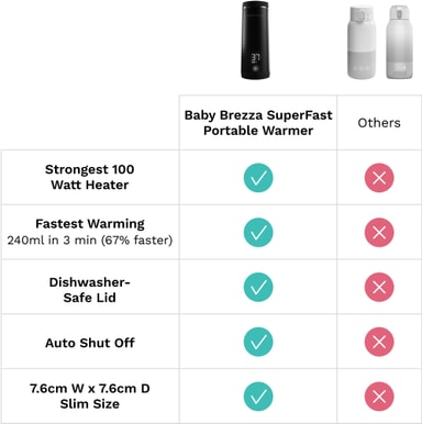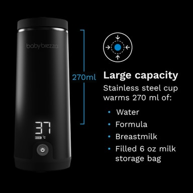 Baby Breeza Superfast Portable -vauvanpullo BRZ0179 lämmittää 240 ml vain kolmessa minuutissa, ja siinä on neljä lämpöasetusta vedelle, äidinmaidonkorvikkeelle tai rintamaidolle. Sen kompaktin ruostumattoman teräksen muotoilu sopii mukitelineisiin ja laukkuihin, lämmittää tasaisesti, suojaa ravintoaineita ja toimii langattomasti useiden pullojen lämmittämiseen yhdellä latauksella.