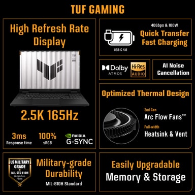 TUF Gaming A16 tarjoaa 1 Tt PCIe Gen 4 -tallennustilaa, joka sopii täydellisesti suurille pelikirjastoille. 16 Gt:n suorituskykyinen DDR5-muisti takaa sujuvan toiminnan vaativissa peleissä ja muissa samanaikaisissa tehtävissä, kuten moniajossa. Parasta on, että sekä tallennustila että muisti ovat täysin käytettävissä ja päivitettävissä, mikä tarjoaa joustavuutta ja varmuutta tulevaisuuden tarpeisiin.