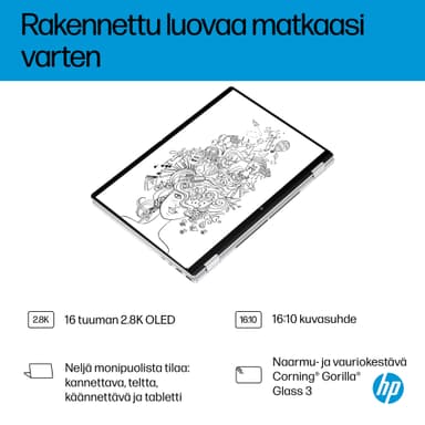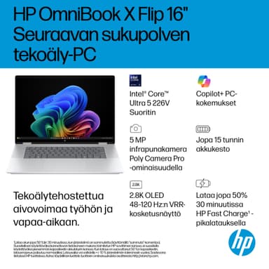 HP OmniBook X Flip 16" Next Gen AI-PC tuo tulevaisuuden ulottuvillesi. Olitpa sitten viihteen tai luovan työn äärellä, tämä tekoälyllä tehostettu tietokone tarjoaa prosessoritehon ja suorituskyvyn, jotka tekevät siitä mahdollista. Upealla 16" 2.8K OLED-näytöllä varustettu laite voidaan asettaa tasaiseksi, taittaa tai kääntää – ja nauttia elävistä, korkeakontrastisista väreistä mistä tahansa kulmasta. Tyylikkäästä, kierrätetystä metallista¹ valmistettu ja taustavalaistulla näppäimistöllä varustettu tietokone tekee tulevaisuudestasi kirkkaan.