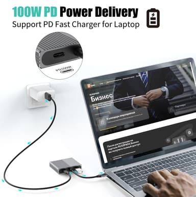 MäärityksetMalli: 1–4 USB-C TelakointiasemaPortit:1 × HDMI 4K@60Hz1 × DisplayPort 4K@60Hz1 × USB-C PD (max 100W)1 × USB-A 3.0 (5 Gbps, enintään 10W lataus)Syöttö: 1 × USB-CMateriaali: AlumiiniVäri: Musta / Space GreyCertifikaatit: CE, FCC, RoHSPlug-and-play: Tukee Windows 10+/MacOS 11+/ChromeOS, ajureiden asennusta ei tarvitaYhteensopivuus: MacBook Pro/Air (2016–2024), Dell XPS 13/15, HP EliteBook, Surface Laptop, muut USB-C-laitteet, mukaan lukien USB4/Thunderbolt 3/4Koko: 80 × 50 × 15 mmPaino: 85 gNäyttöresoluutiot ja päivitysnopeudetWindows:DP1.2 (ilman DSC) → 1080P@60Hz + 1080P@60HzDP1.4 (DSC:llä) → 4K@60Hz + 4K@60HzDP1.4 (ilman DSC) → 4K@30Hz + 1080P@60HzMacOS:HDMI + DP → 4K@60Hz + 4K@60HzHuom: MacOS ei tue MST:tä, mikä rajoittaa laajennetun näytön käyttöä. Sama kuva näkyy molemmilla näytöillä.OminaisuudetDual Video Output: HDMI ja DisplayPort tukevat peilausta, laajennettua ja duplikoitua näyttöä maksimaaliseen tuottavuuteen.100W PD-lataus: Nopea lataus video- ja dataporttien käytön aikana.USB 3.0 5 Gbps: Nopea tiedostonsiirto ja mahdollisuus ladata älypuhelimia, tabletteja ja vähävirtaisia lisälaitteita.Kompakti & Kestävä muotoilu: Alumiinirakenne kultapinnoitetuilla liittimillä ja ylivirta-/oikosulkusuojaus luotettavaan liitäntään.Sisältö1 × NÖRDIC 1–4 USB-C Telakointiasema
