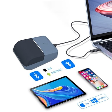 Monipuoliset liitäntävaihtoehdot: Nauti saumattomasta liitettävyydestä sekä Bluetooth- että USB-vaihtoehdoilla. Tämä lämpötulostin tarjoaa joustavia liitäntätapoja tarpeidesi mukaan. Yhdistä langattomasti Bluetoothin kautta älypuhelimeesi tai tablettiisi tulostaaksesi liikkeellä ollessasi, tai käytä USB-liitäntää vakaan ja luotettavan yhteyden muodostamiseksi tietokoneeseesi. Kaksi liitäntävaihtoehtoa varmistavat yhteensopivuuden monenlaisten laitteiden kanssa, mikä helpottaa integrointia olemassa olevaan työnkulkuun. Tulostatpa sitten mobiililaitteesta tai pöytätietokoneesta, tämä tulostin tarjoaa vaivattoman tulostuskokemuksen. Se on yhteensopiva sekä Android- että iOS-laitteiden sekä Windows- ja macOS-käyttöjärjestelmien kanssa.