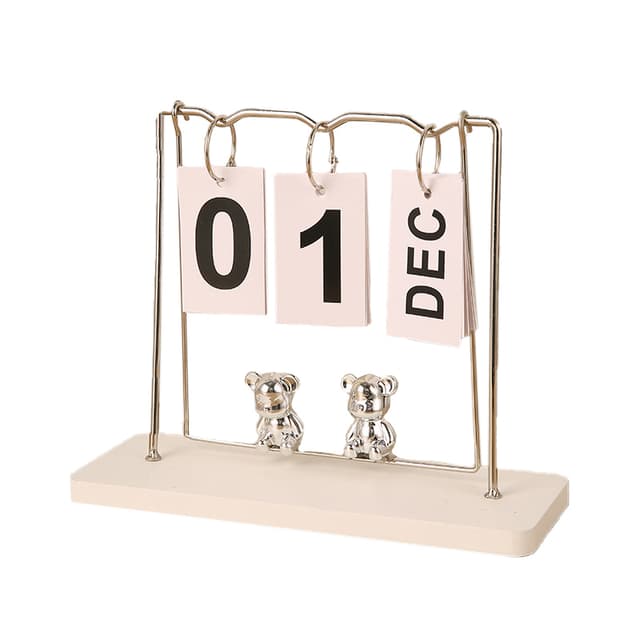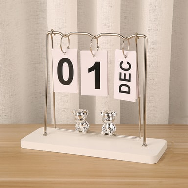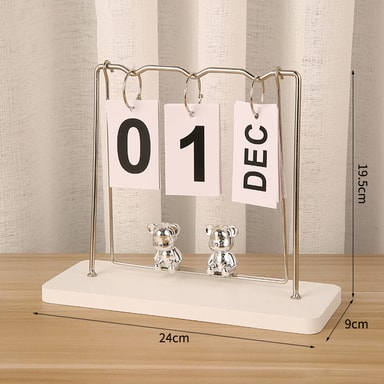 Manuaalinen kalenteri: Tässä koristeessa on ainutlaatuinen manuaalinen kääntökalenteri, jonka avulla voit muuttaa päivämäärää interaktiivisesti. Kääntösivuinen muotoilu lisää luovan ja leikkisän elementin päivittäiseen rutiiniisi. Täydellinen niille, jotka arvostavat käytännönläheistä toimintaa, tämä ikuinen kalenteri poistaa perinteisten paperikalentereiden tarpeen. Nauti päivämäärän päivittämisen tuntumasta ja lisää samalla ripauksen mielikuvitusta työpöydällesi tai hyllyllesi.
