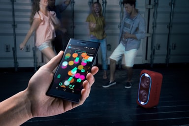 Sinun ei tarvitse olla säätämässä juhlan kaiuttimia ja ääntä yhdessä paikkaa koko juhlan ajan. Lataa vain tehokas Sony Music Center -sovellus ja hallitse musiikki- ja ääniasetuksia kaikkialta älypuhelimellasi.