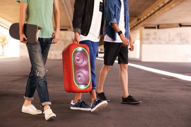 One-box Sony A/V -bilekaiutin mahdollistaa useamman älypuhelimen kytkemisen laitteeseen langattomasti Bluetoothin kautta. Voit myös käyttää USB-liitäntää tai yhdistää kaiuttimeen mikrofonin. Sony Music Center -sovellus ja Fiestable mahdollistavat musiikin soittamisen, vaikka et seisoisikaan koko iltaa kaiuttimen vieressä. Nauti 14 tunnista langatonta musiikintoistoa (3,5 tuntia maksimiäänenvoimakkuudella ja 5 tuntia, kun Stamina Mode on päällä). Kätevä kahva helpottaa laitteen kantamista.