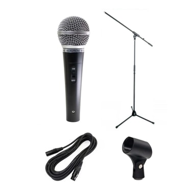 Grooveland Täydellinen mikrofonisetti, joka sisältää: dynaamisen mikrofonin katkaisijalla, 5 metrin XLR-mikrofonikaapelin, mikrofoniständin ja mikrofonipidikkeen.
