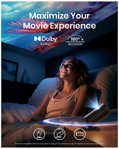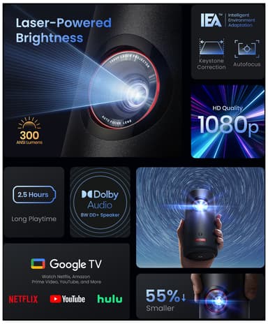 Nebula Capsule 3 Laser -projektori tarjoaa upean Full HD -kuvan ja Dolby Digital -kaiuttimien parantaman erinomaisen äänen. Sitä on helppo kuljettaa ja se tarjoaa 2,5 tunnin akkukeston, joten voit nauttia suosikkielokuvistasi missä tahansa.Tutustu ominaisuuksiin