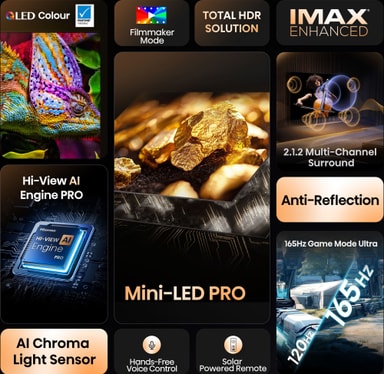 Tämä Hi-View AI Engine PRO -prosessori analysoi jokaisen ruudun reaaliajassa. Tekopälypohjaisen kohtausten tunnistuksen ja adaptiivisten säätöjen avulla se optimoi värit, kontrastin ja liikkeen ylivoimaista kuvanlaatua varten. Jokainen kuva tuntuu yksityiskohtaisemmalta, luonnollisemmalta ja mukaansatempaavammalta. Se herättää suosikkiohjelmat, elokuvat ja pelit eloon kuin koskaan ennen.