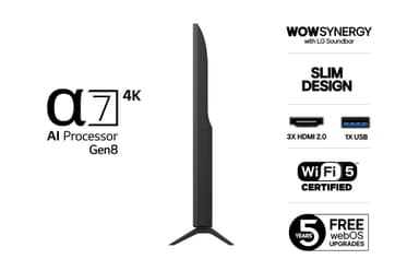 Ohut UA75 tarjoaa terävän 4K HDR -kuvan, sujuvan suorituskyvyn ja helpon striimauksen α7 AI -prosessorin ja webOS-räätälöinnin ansiosta. Magic Remote -yhteensopiva ja tukee suosikkiälytoimintoja – täydellinen arjen viihteeseen.Tutustu ominaisuuksiin