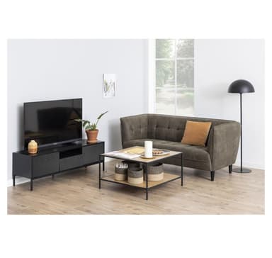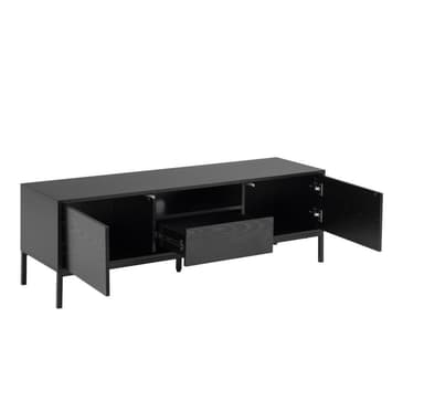 Seaford TV-yksikkö, kansi ja runko mustaksi PU-maalattu MDF, 2 ovea ja laatikko tuhkanmusta karkea melamiini, pohja mattamusta karkea jauhemaalattu metalli, metallikannattimet.