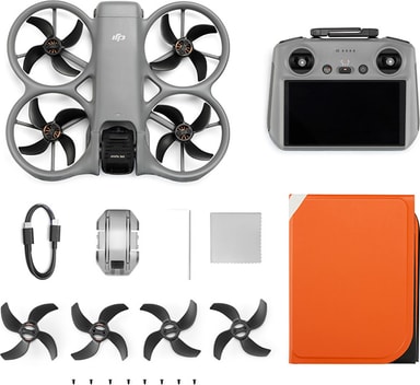 Dronen mukana saat DJI RC 2 -ohjaimen sujuvaa hallintaa varten sekä älykkään lentoakun, varapropellit ja linssin puhdistusliinan.