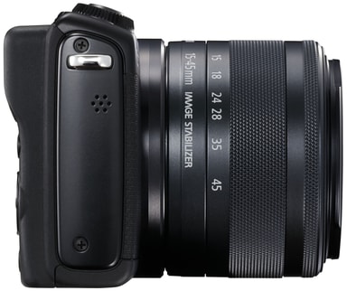 EF-M-objektiivi: Kameran mukana tulee EF-M 15-45mm f/3.5-6.3 objektiivi, jossa on kolminkertainen optinen zoomi. Kameran moottori on hiljainen ja sisäänrakennettu kuvanvakaaja pitää huolen siitä, että kuvista tulee teräviä ja tarkkoja.