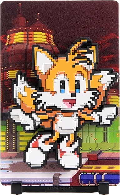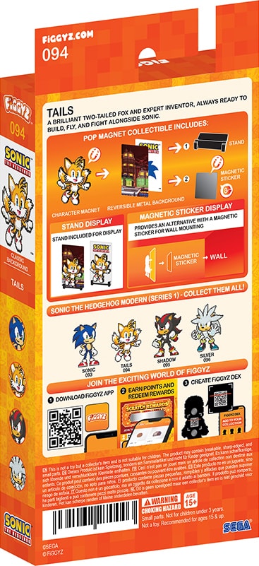 First 4 Figures FiGGYZ Sonic the Hedgehog -hahmomagneetti sisältää käännettävän metallisen takalevyn, joka tarjoaa kaksi esillepanovaihtoehtoa, pikselitaidetyylisen hahmon, 3D-pop-out-efektin, esillepanopohjan ja magneettisen tarran.