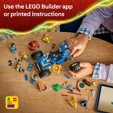 • AUTOLELU LASTEN LEIKKEIHIN – Jayn muuntautumiskykyinen auto ‑rakennuslelun (71856) parissa 8 vuotta täyttäneet pojat ja tytöt voivat muistella NINJAGO® Lohikäärmeiden nousu ‑televisiosarjan 4. kauden vauhdikkaita tapahtumia