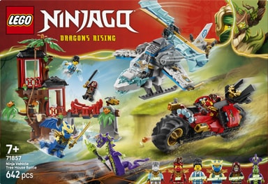 NINJAGO® Lohikäärmeiden nousu ‑televisiosarjan 4. kauteen pohjautuva Ninjamenopelit ja puumajataistelu ‑rakennussetti (71857) sisältää kaiken, mitä 7 vuotta täyttäneet pojat ja tytöt tarvitsevat vauhdikkaisiin taisteluleikkeihin. Setissä on 3-kerroksinen puumaja, helikopterilelu, moottoripyörälelu ja 6 minihahmoa.