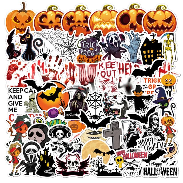 60 tarraa erilaisilla Halloween-aiheilla, lähes ei toistuvia. Nämä tarrat sopivat useimpien esineiden koristeluun. Ne on valmistettu kestävästä PVC:stä ja ne voidaan helposti poistaa ja levittää uudelleen jättämättä jäämiä.