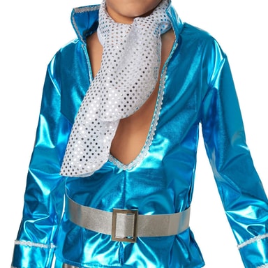 Tämä poikien disco-poikapuku on valmistettu kiiltävästä kaksivärisestä kankaasta. Sinisessä yläosassa on syvällä kaula-aukolla hopeinen reunus ja pystykaulus. Hihansuissa on kaksirivinen hopeinen reunus. Puserossa on edessä halkio.