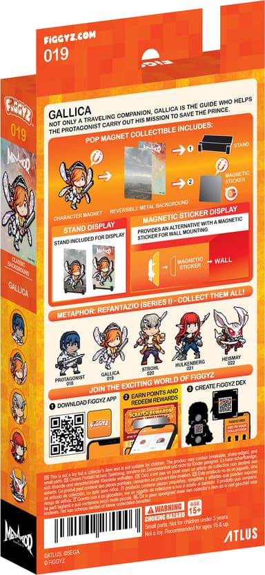 First 4 Figures FiGGYZ Metaphor: ReFantazio -hahmomagneetti sisältää käännettävän metallisen takalevyn, joka tarjoaa kaksi esillepanovaihtoehtoa, pikselitaidetyylisen hahmon, 3D-pop-out-efektin, esillepanopohjan ja magneettisen tarran.Tutustu ominaisuuksiin