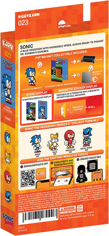 First 4 Figures FiGGYZ Sonic the Hedgehog -hahmomagneetti sisältää käännettävän metallisen takalevyn, joka tarjoaa kaksi esillepanovaihtoehtoa, pikselitaidetyylisen hahmon, 3D-pop-out-efektin, esillepanopohjan ja magneettisen tarran.Tutustu ominaisuuksiin