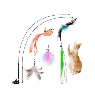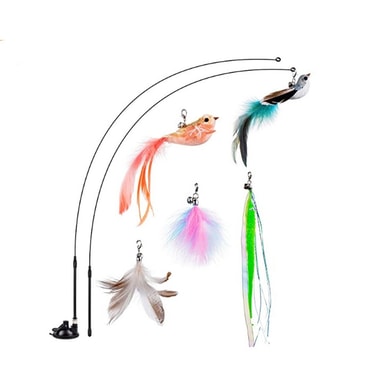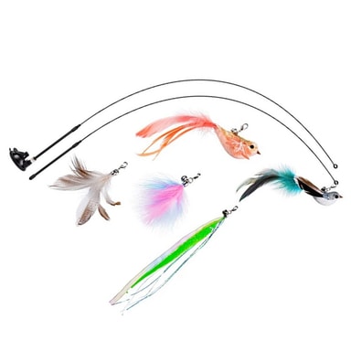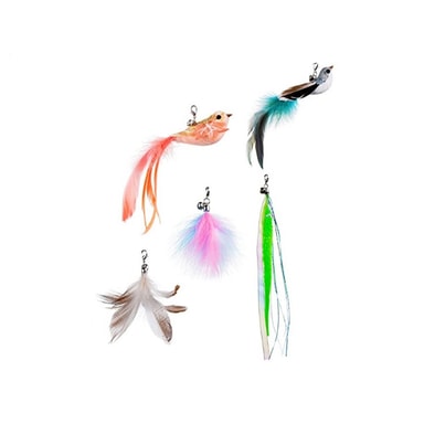 Vaihdettavat höyhenpäät: Sarja sisältää viisi vaihdettavaa höyhenpäätä, mikä takaa pitkäkestoisen hauskanpidon kissallesi. Höyhenpäät on valmistettu korkealaatuisista materiaaleista, jotka ovat turvallisia kissallesi. Helppokäyttöinen koukkurakenne mahdollistaa höyhenpäiden nopean ja yksinkertaisen vaihdon, mikä pidentää lelun käyttöikää. Eri väriset höyhenet tarjoavat visuaalista stimulaatiota, pitäen kissasi kiinnostuneena ja aktiivisena. Lisätyt kellot luovat houkuttelevan äänen, joka edelleen houkuttelee kissasi huomiota, mikä tekee leikkihetkistä entistä jännittävämpiä. Tämä ominaisuus varmistaa, että kissallasi on aina tuore ja jännittävä lelu, jolla leikkiä.