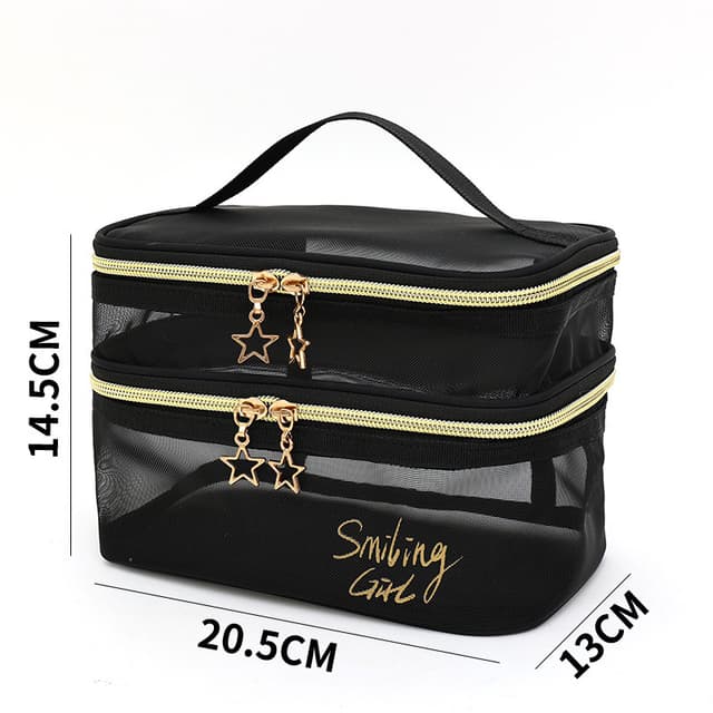 Kaksikerroksinen muotoilu: Älykkään kaksikerroksisen muotoilun ansiosta tämä meikkipussi tarjoaa paremman järjestyksen ja erottelun tavaroillesi. Kahden erillisen osaston avulla voit luokitella tavarasi pitäen meikkisiveltimet erillään ihonhoitotuotteista tai hygieniatuotteista. Tämä estää ristikontaminaation ja varmistaa, että kaikki pysyy puhtaana ja paikallaan. Kaksikerroksinen rakenne lisää myös lisäsuojaa herkille tavaroille, mikä tekee siitä ihanteellisen matkustamiseen.
