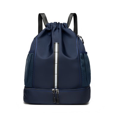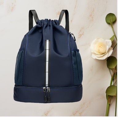Monipuolinen muotoilu: Tämän repun monipuolinen muotoilu tekee siitä sopivan monenlaisiin aktiviteetteihin. Olitpa menossa kuntosalille, joogastudiolle, uima-altaalle tai koripallokentälle, tämä laukku kattaa sinut. Kiristysnyörisulku tarjoaa nopean ja helpon pääsyn tavaroihisi, kun taas säädettävät hihnat takaavat mukavan istuvuuden. Tyylikäs ja moderni estetiikka tekee siitä tyylikkään lisävarusteen kaikille kuntoilun harrastajille, yhdistäen saumattomasti toiminnallisuuden muotiin.