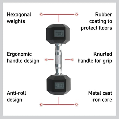 • RULLUN VASTAAVAT PAINOT – kuusikulmion tasaiset reunat käsipaino estää sitä pyörimästä käytön aikana. Käsipainon kestävä kumipinnoite on suunniteltu suojaamaan kodin ja kuntosalin lattioita iskuvaurioilta sekä minimoimaan melua
