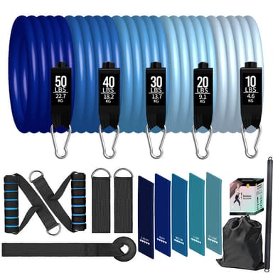 Kestävä ja turvallinen: Valmistettu korkealaatuisesta TPE-materiaalista, nämä vastusnauhat ovat kestäviä ja pitkäikäisiä. Ne on suunniteltu kestämään kovaa käyttöä ja tarjoamaan turvallisen harjoittelukokemuksen. Pehmustetut kahvat ja nilkkalenkit takaavat mukavan ja tukevan otteen harjoittelun aikana. Voit luottaa siihen, että nämä vastusnauhat kestävät päivittäistä käyttöä ja auttavat sinua saavuttamaan kuntotavoitteesi.